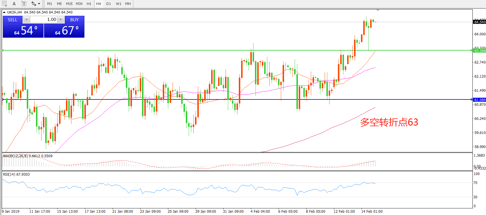 4小时图看,油价经过连续整理站稳63美元,昨日回踩确认支撑有效,均线系统呈现多头形态, MACD红柱增加,日内继续上行概率较大。
