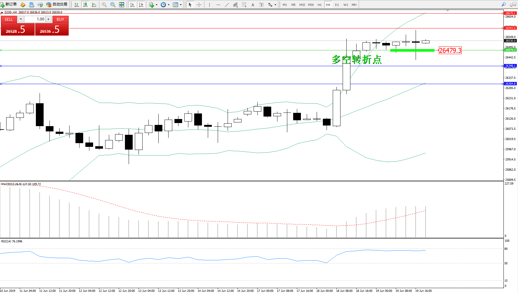 道琼斯指数6月19日(周三)收盘上涨38.50点,涨幅0.15%,报26504.00点。美联储利率决议维持利率在2.25%-2.5%不变,美联储主席鲍威尔新闻发布会:对政策声明作出重大调整,将采取适当措施维持扩张;点阵图首次发出降息信号,但尚未真正讨论降息规模,今年经济表现合理,GDP增速预期显示增长前景模糊;坚定实现2%的通胀目标,预计回升至2%的步伐放缓;金融市场的风险情绪恶化,制造业、投资和贸易走软。