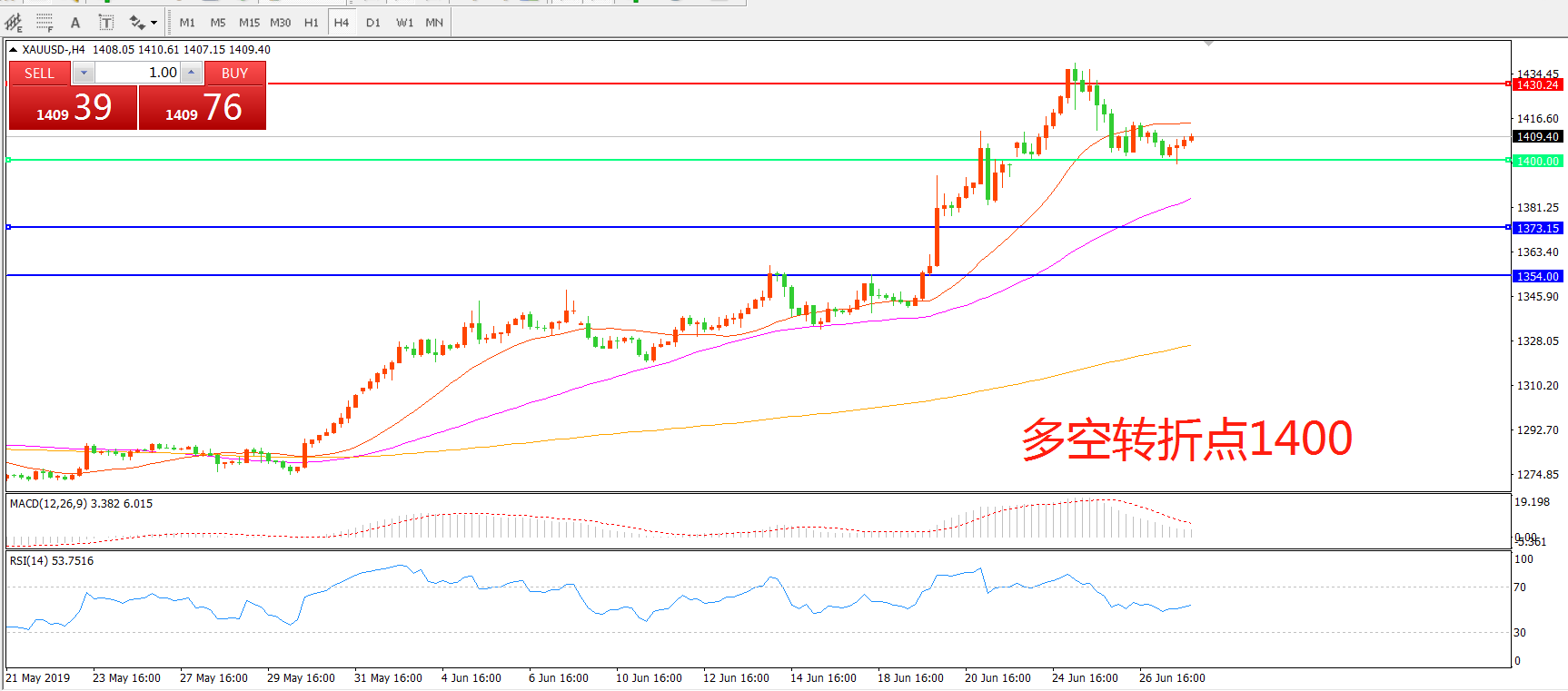 周四(6月27日),美国方面公布的经济数据中规中矩,金价一度跌破1400关口,但随后收复。目前市场的焦点转向周末的G20峰会,G20峰会将于6月28日至29日在日本大阪举行。在周末G20峰会召开之前,市场对峰会上的决策能缓和全球贸易紧张寄予希望,这种乐观情绪重燃了投资者对风险资产的兴趣,施压金价。中美双方将于会议期间将讨论贸易问题,结果难以预料,但肯定会对市场产生巨大影响。