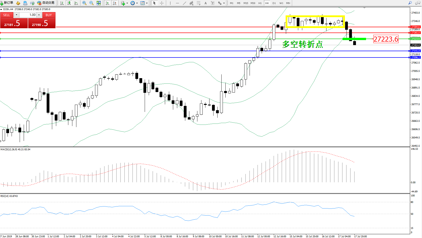道琼斯指数DJ30—— 4小时K线图显示: