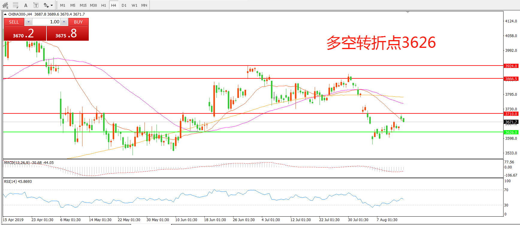 4小时图看,沪深300指数震荡反弹 ,触碰3710附近小幅回落,均线系统有拐头迹象,MACD绿柱走平,日内延续震荡概率较大.