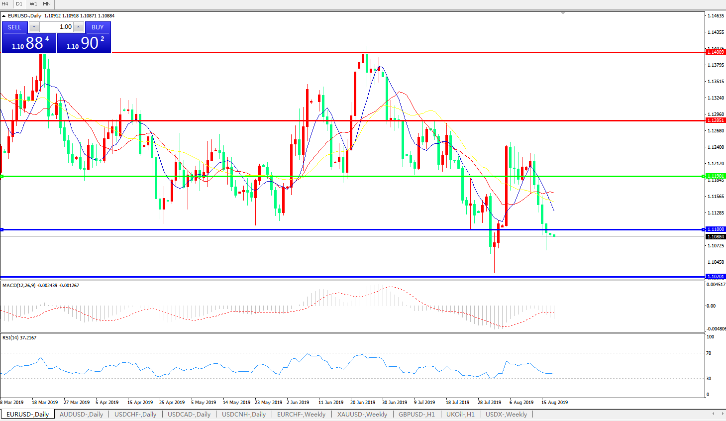 欧元兑美元在周五日内继续运行于低位,欧洲时段加速下跌,触及1.1085这一8月2日以来的两周新低,令汇价有望出现日线四连跌,此前上周以来的盘整趋势也因而面临破溃;此前,在周四北美时段开盘之际,欧洲央行官员曾表示,或需要在未来祭出“力度更大”的一揽子宽松方案,此消息令欧元汇率应声大跌。而关于此状况的解读,连同意大利和德国等欧元区核心国家的经济与政治局势,在周五继续带动欧元承压;业内分析人士因此指出,在1.11关口再度失守之后,欧元汇价新一波下行浪潮已经重启,眼下的关键支撑位位于1.1070初,如果失守,则此前的年内低点1.1027乃至1.10关口都将成为下一步的目标。市场近期将密切关注下周全球央行年会上各国央行大佬们对于当前竞争性宽松浪潮前景的表态,并据此判断汇市的下一步走向。
