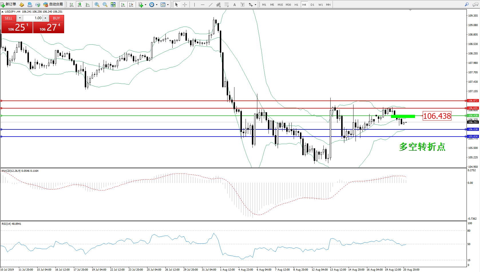 美元兑日元下跌0.38%106.23;之前触及106.16的低点;欧洲方面英国和意大利的政局不稳前景,连同国际贸易环境的顾虑犹存,都带动风险偏好情绪恶化,令避险日元受宠。美国总统特朗普再次敦促美联储大举降息,将基准利率下调1个百分点。本周市场聚焦于杰克逊霍尔央行年会,等待着美联储主席鲍威尔的发言。