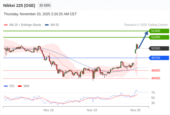 日经225股指期货 (OSE) 当日内: 在49700之上,看涨。