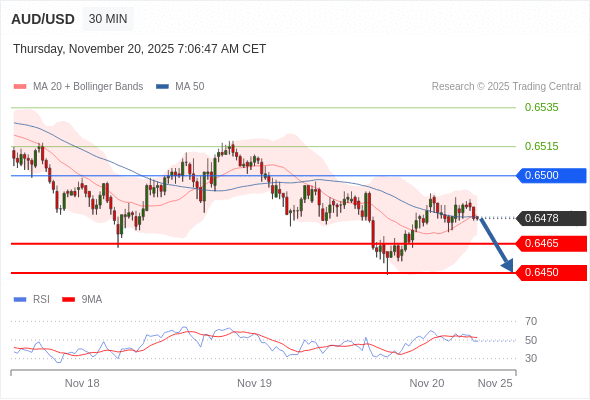 在 0.6500 之下,看跌,目标价位为 0.6465 ,然后为 0.6450 。