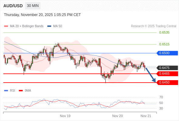 在 0.6500 之下,看跌,目标价位为 0.6465 ,然后为 0.6450 。