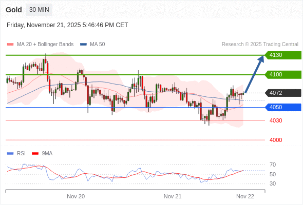 在 4050 之上,看涨,目标价位为 4100 ,然后为 4130 。