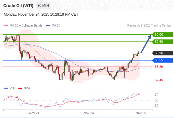 在 58.55 之上,看涨,目标价位为 59.60 ,然后为 60.00 。