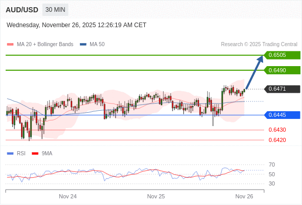 在 0.6445 之上,看涨,目标价位为 0.6490 ,然后为 0.6505 。