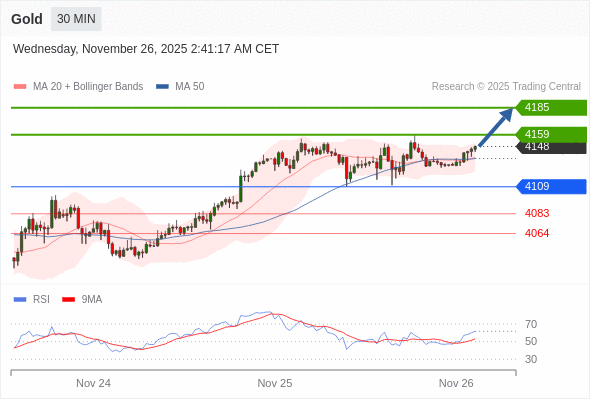 在 4109 之上,看涨,目标价位为 4159 ,然后为 4185 。