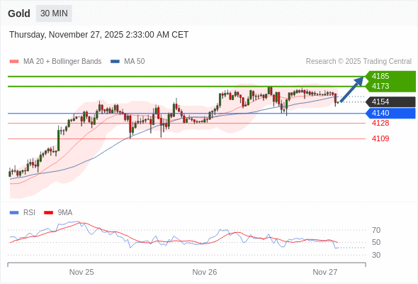 在 4140 之上,看涨,目标价位为 4173 ,然后为 4185 。