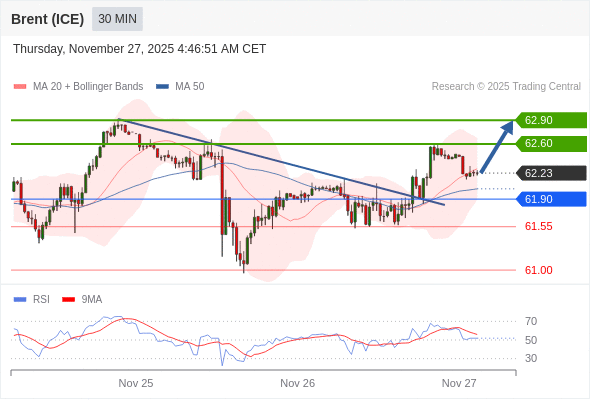 在 61.90 之上,看涨,目标价位为 62.60 ,然后为 62.90 。
