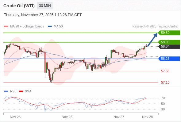 在 58.25 之上,看涨,目标价位为 59.05 ,然后为 59.50 。