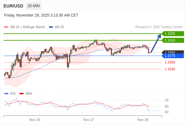 在 1.1575 之上,看涨,目标价位为 1.1610 ,然后为 1.1625 。