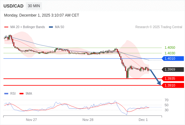在 1.4010 之下,看跌,目标价位为 1.3935 ,然后为 1.3910 。