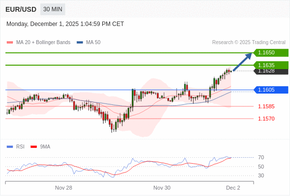 在 1.1605 之上,看涨,目标价位为 1.1635 ,然后为 1.1650 。