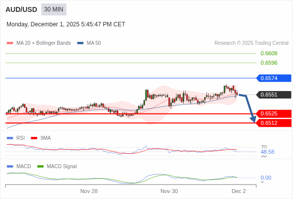 澳元/美元 当日内 : 逐渐下跌,当 0.6574 阻碍上行,则 0.6512 为目标位。