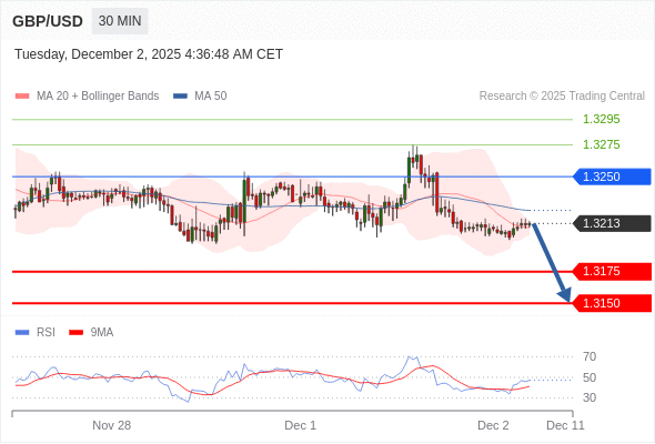 在 1.3250 之下,看跌,目标价位为 1.3175 ,然后为 1.3150 。