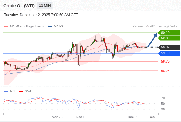 在 59.10 之上,看涨,目标价位为 59.85 ,然后为 60.10 。