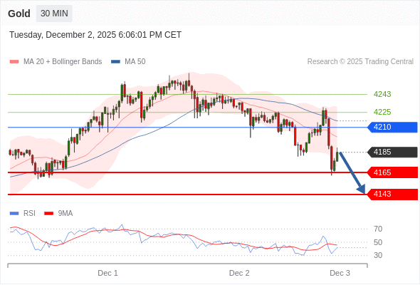 在 4210 之下,看跌,目标价位为 4165 ,然后为 4143 。