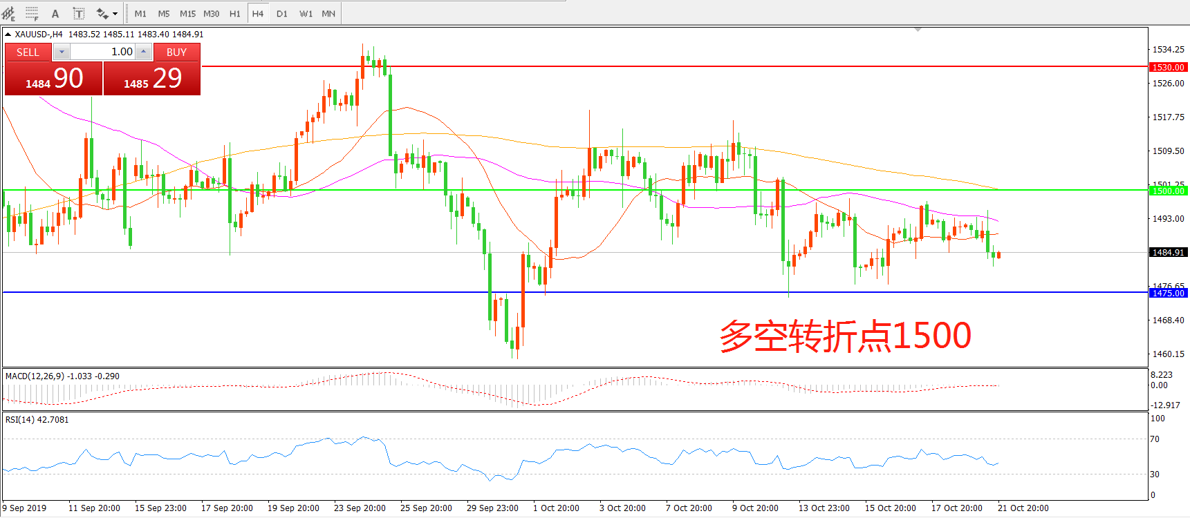 周一(10月20日),在英国与欧盟之间的协议希望周末达成失败后,英国脱欧的局面继续恶化。英国议会再次推迟了三个月的投票以达成英国退欧协议,而受中美谈判乐观情绪影响,现货黄金短线下跌逾12美元,自1490美元上方回落至1482.98美元/盎司,最终收报1483.74美元/。市场相对平静的情况下,金价维持震荡的概率较大。