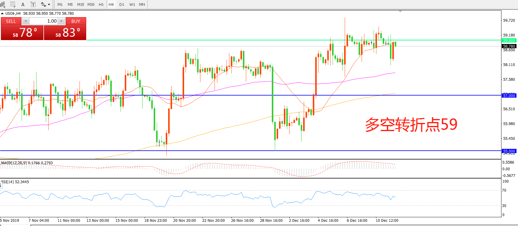 4小时图看,油价延续高位震荡,59美元依然是多空分水岭,均线系统呈多头排列,MACD红柱减少,RSI指标走平,日内延续震荡概率较大。