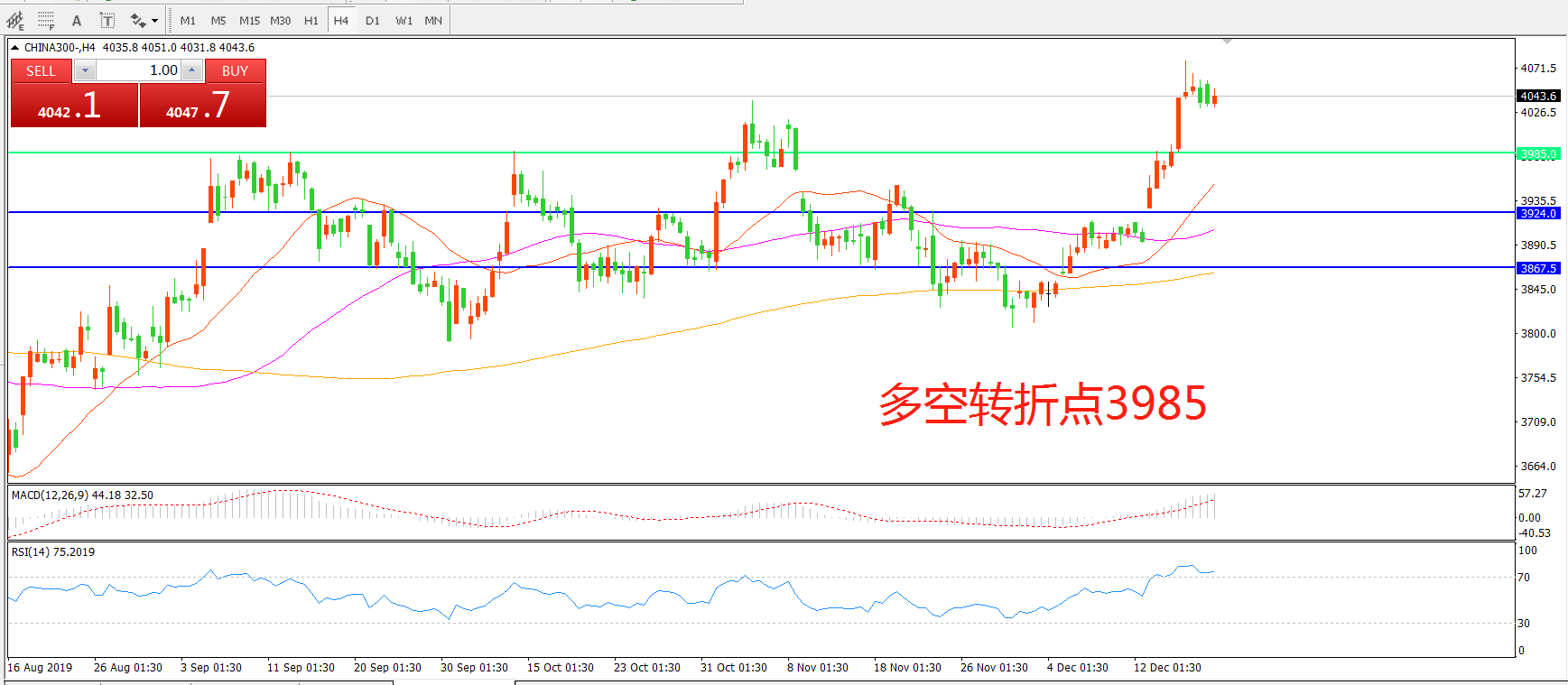 4小时图看,沪深300呈现冲高回落走势,4035附近存在短期阻力,但整体仍处于上行通道之中,均线系统走平,MACD红柱增加,RSI指标向下,日内延续上行概率较大。