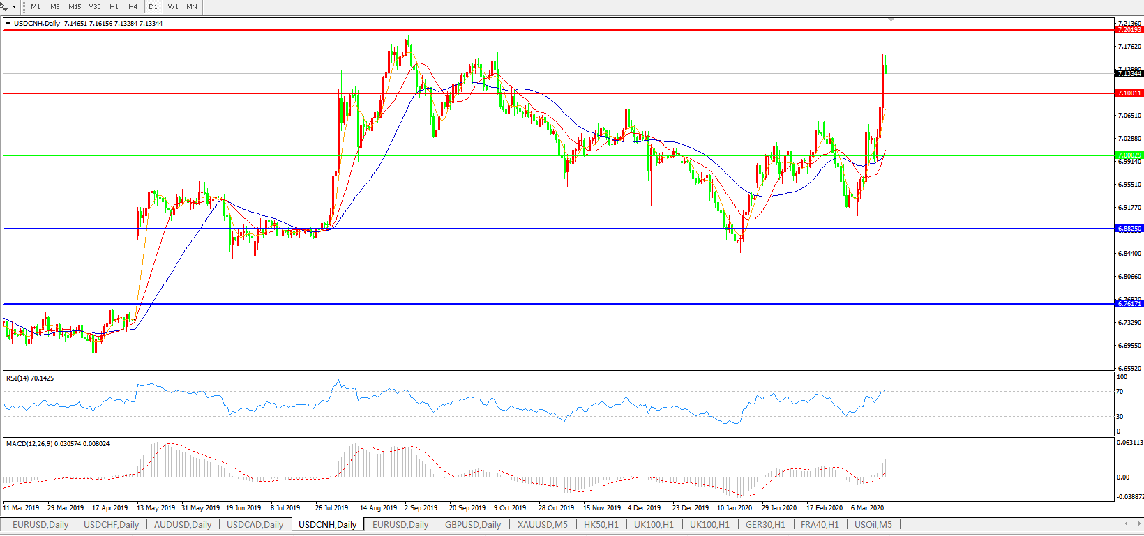 美元兑人民币USDCNH 日线图: