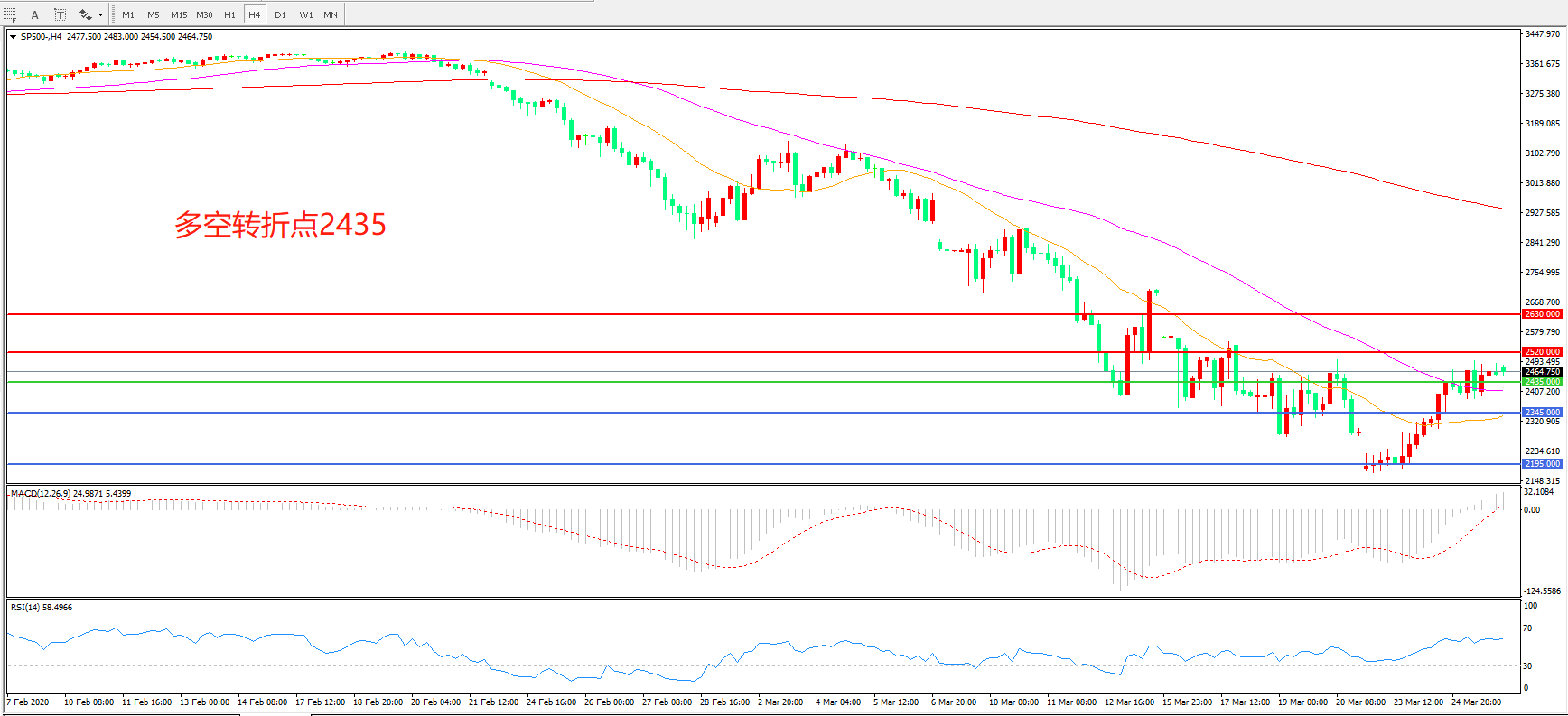 周三(3月25日),在美国白宫与参议院就刺激方案达成协议后,投资者情绪受到鼓舞, 标普500一度大涨,但特朗普欲四月重启美国经济的想法引发各界担忧,世卫组织表示,如果过快放松社会管控措施,美国可能会成为这场疫情全球大流行的下一个“震中”,最终标普500冲高回落,收报2464.75点。