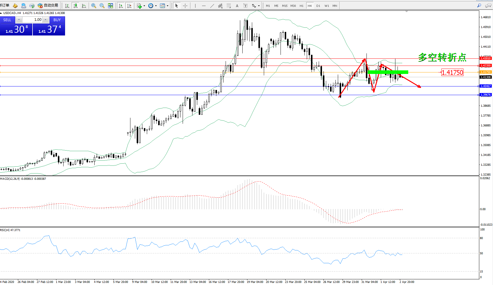交易策略:1.41750下方看跌,目标1.40467、1.39676