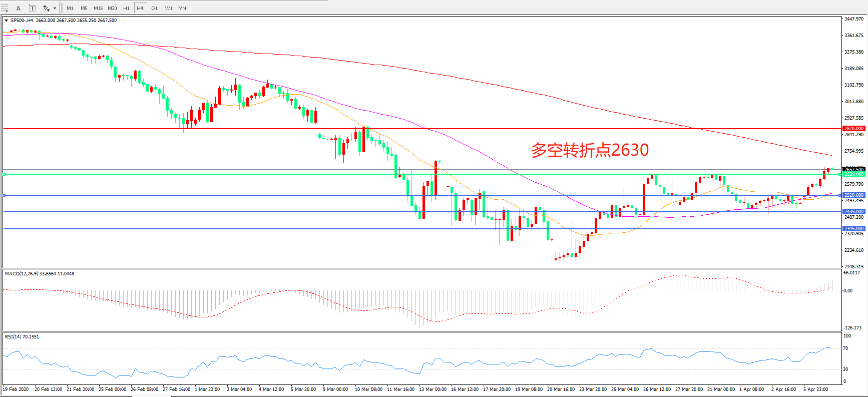 4小时图看,标普500震荡上行,整体表现有所回暖,2630成为短期多空分水岭,MACD红柱增加,RSI指标走平,日内延续震荡概率较大。