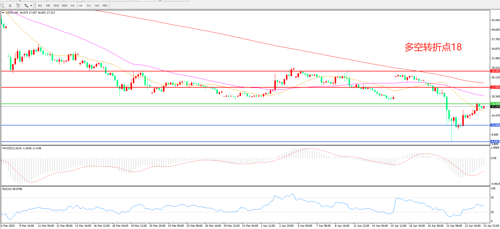 4小时图看,油价震荡上行触碰18美元后小幅回落,整体走势有所回暖,均线系统走平,MACD绿柱缩短,RSI指标向上,日内震荡上行概率较大。