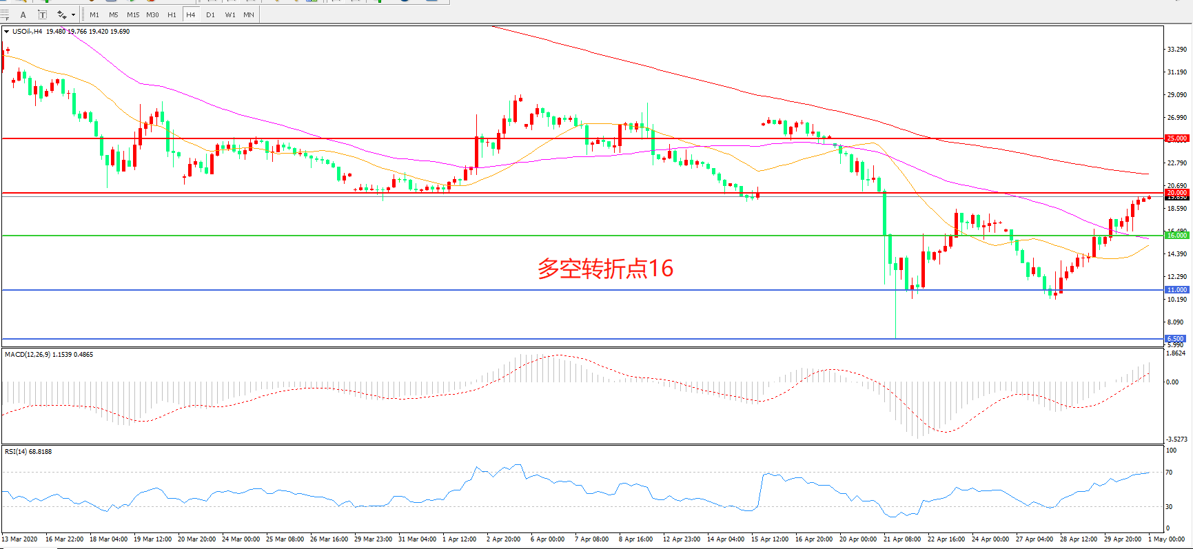 4小时图看,油价震荡上行,整体走势有所回暖,形态上有形成双底结构的迹象,均线系统走平,MACD红柱增加,RSI指标向上,如能突破20美金阻力,延续上行的概率较大。