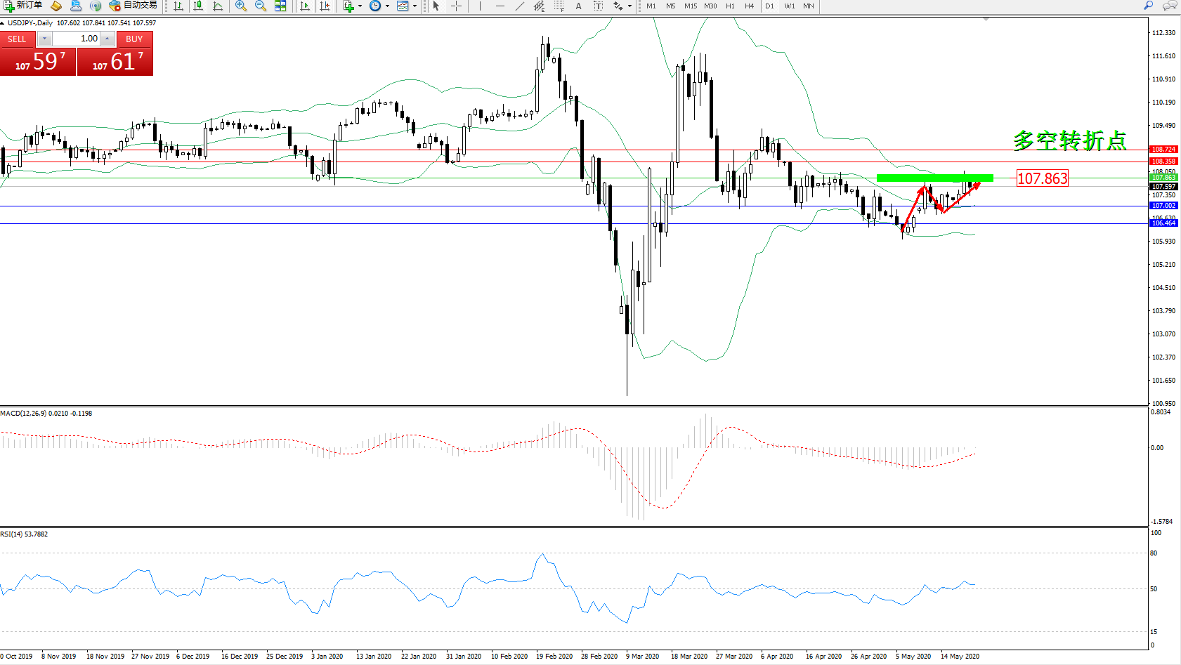 美元兑日元纠结于107.6附近徘徊,尽管美元指数承压,但更多是由于避险情绪下降,近期投资者对美国经济复苏的信心大增,美国50个州悉数不同程度的复工,微观层面也显示经济在触底,而日本经济仍需要一段时间才能恢复,因此日元短期吸引力下降。贸易数据证实日本经济正在迅速恶化,预计贸易低迷还会持续一两个月,然后才会回升。需要很长一段时间才能回到病毒出现之前的状态。经济的动态显然在发生改变。随着日本放松紧急封锁措施,服务业经济可以开始逐渐复苏;尚未用经济数据来确认底部,但随着解除封锁,全球经济正走向触底。经济活动正在逐渐恢复。