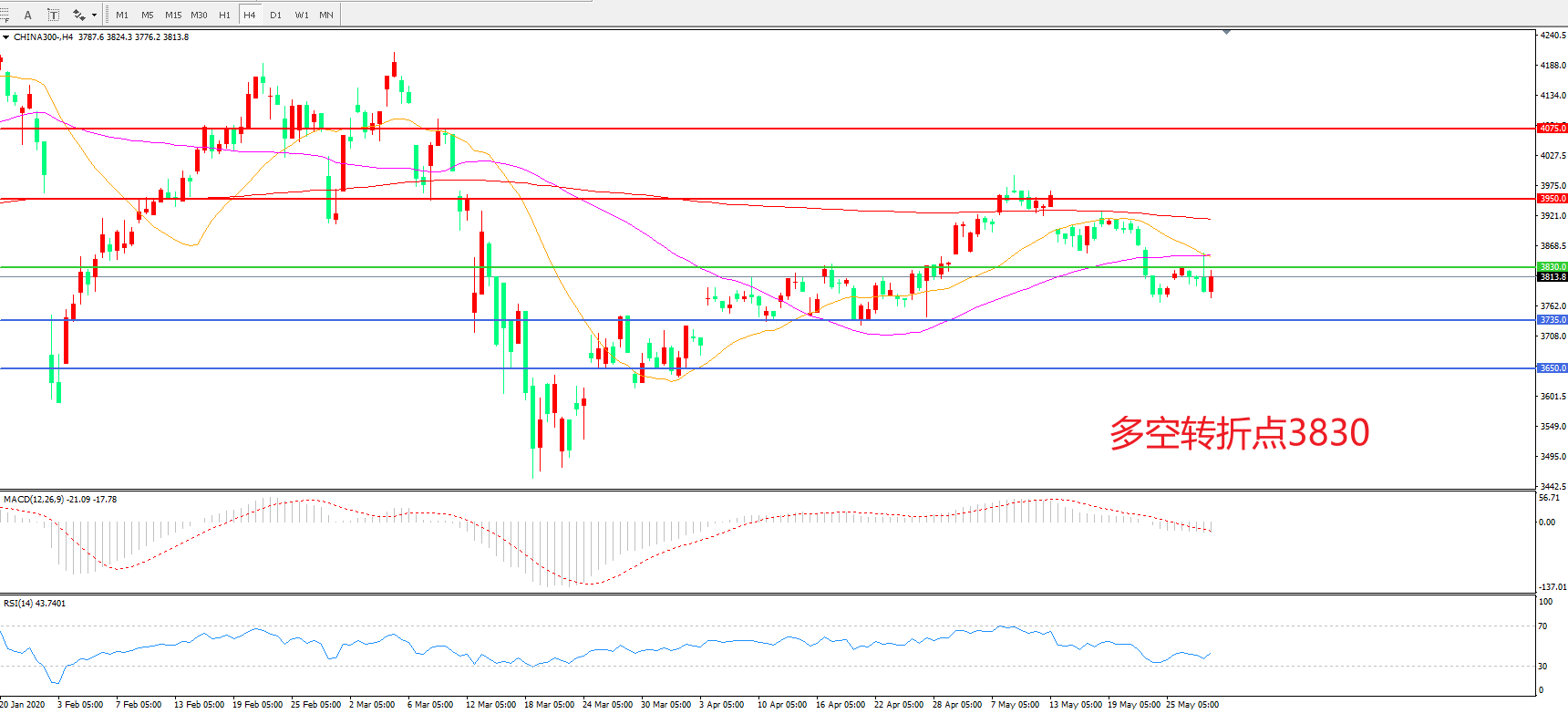 4小时图看,沪深300延续震荡走势,多空博弈进入白热化,3830成为短期多空分水岭,均线系统走平, 形成阻力区间,MACD绿柱增加,RSI指标走平,日内延续震荡概率较大。