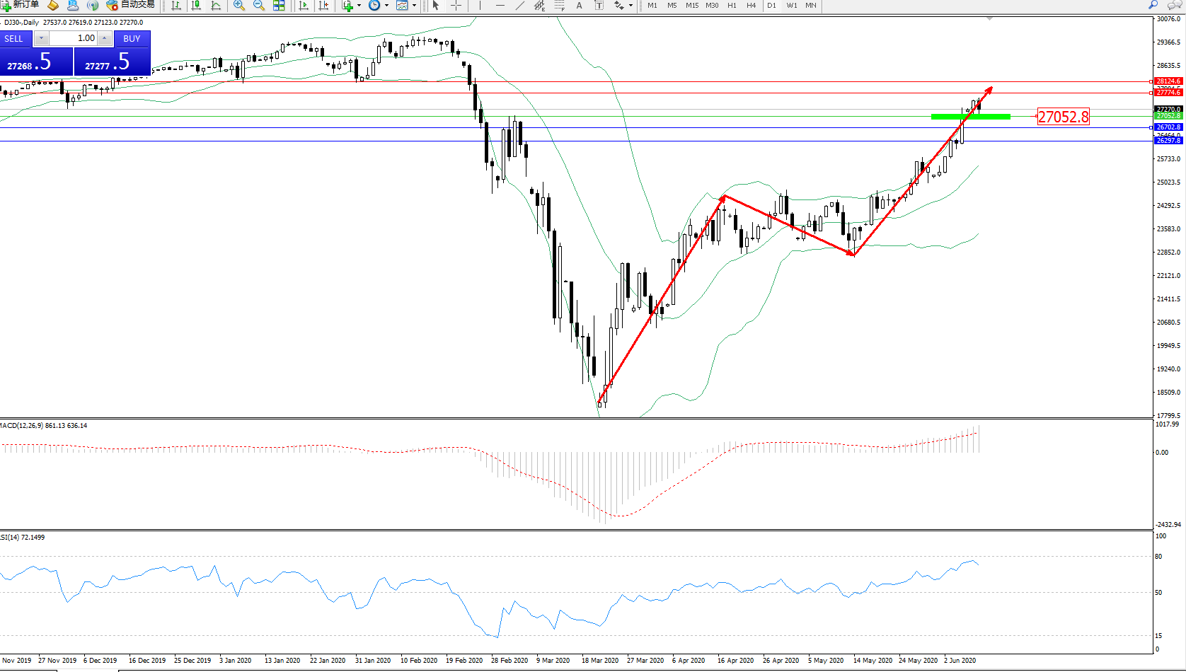 道琼斯指数69日(周二)收盘下跌300.10点,跌幅1.09%,报27272.30点。美股三大指数收盘涨跌不一,在能源和工业股的带领下,标普500指数停止了大幅上涨走势,投资者担忧近期风险资产的涨势可能过头;在6月份的6个交易日里上涨10%后,小型股周二跑输大盘;纳斯达克100指数一度突破10000点,苹果公司大涨。创纪录的反弹令全球股票市场市值增加了21万亿美元,技术指标显示反弹幅度可能已过头。美国股市人气在不到三个月的时间里从极度恐惧转向极度自信。市场风险偏好回落,世界银行预计今年全球经济前景不容乐观,谨慎的投资者等待美联储政策会议公布经济状况和进一步刺激措施。