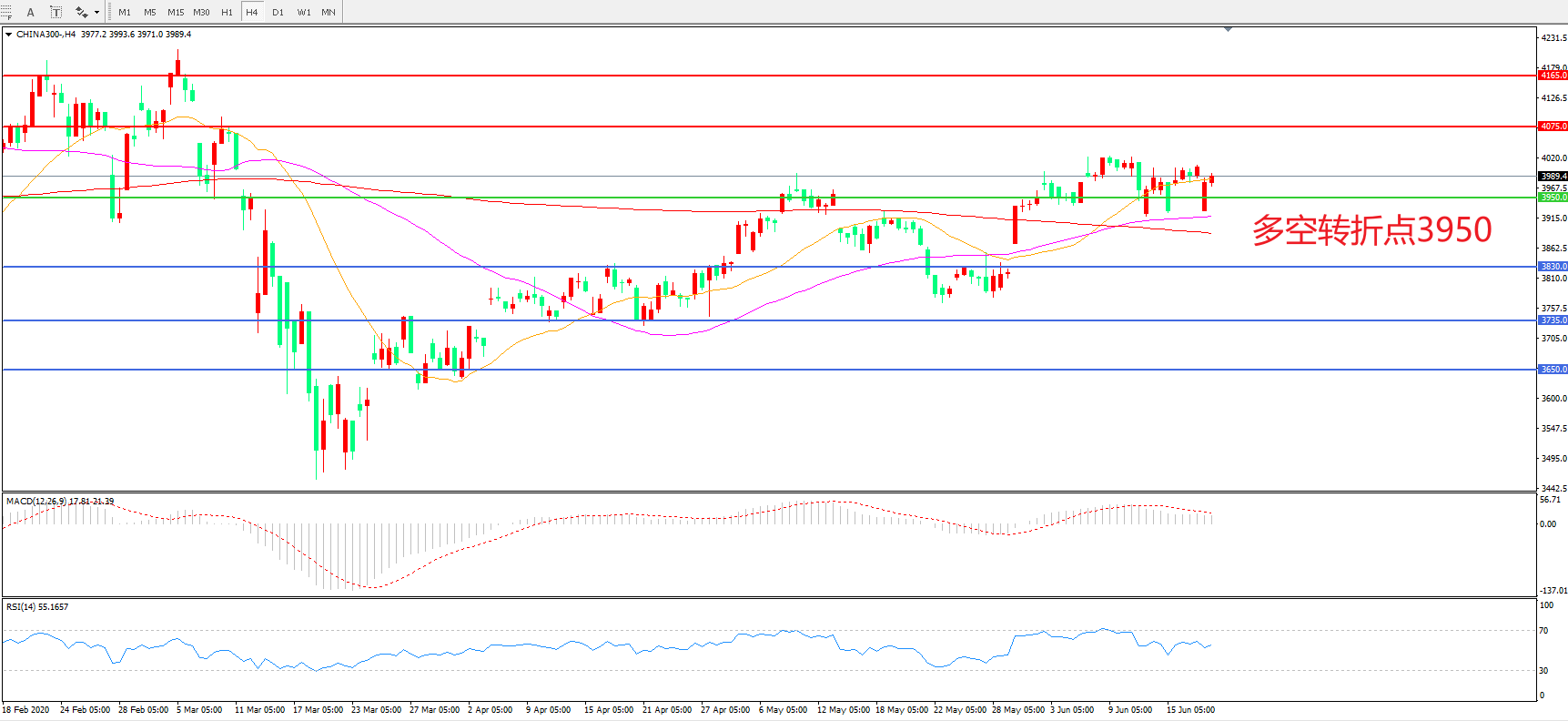 4小时图看,沪深300延续高位震荡走势,3950成为短期多空分水岭,55周期均线成为支撑,均线系统走平,MACD红柱缩短,RSI指标向下,日内延续震荡概率较大。