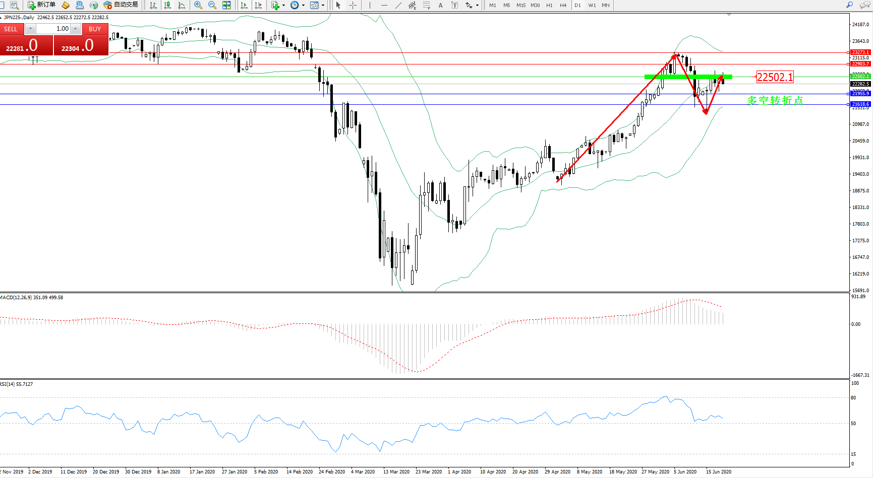 日经225指数6月19日(周五)收盘上涨106.04点,涨幅0.47%,报22461.50点。日本央行会议纪要:成员们一致认为,在控制疫情的时间、新冠病毒对海外和国内经济的影响等方面存在很大的不确定性。一些成员表示,经济持续疲软可能导致银行信贷成本上升,将对金融中介机构造成损害。最重要的是保护就业和企业。日本央行应该大举购买债券以使收益率曲线稳定在较低水平。央行必须审查当前政策的有效性,避免重新陷入通缩。利率进一步下调可能导致利率达到被认为是“反转利率”的水平,即低利率的负面影响超过正面影响。内阁办公室代表表示,日本央行现在的措施将增强政府和日本央行政策组合的效果。由于日本经济面临1930年代大萧条以来最大的危机,通胀目标的达成将会被推迟。日本央行应该无限制地购买日本国债。商业票据和企业债券购买条件应放宽。密切的财政和货币政策合作至关重要。即使到2022财年预计也很难看到通胀率迈向央行的目标。新的措施应该包括中小企业贷款比率较高的银行。将融资救助延长6个月是合适的。