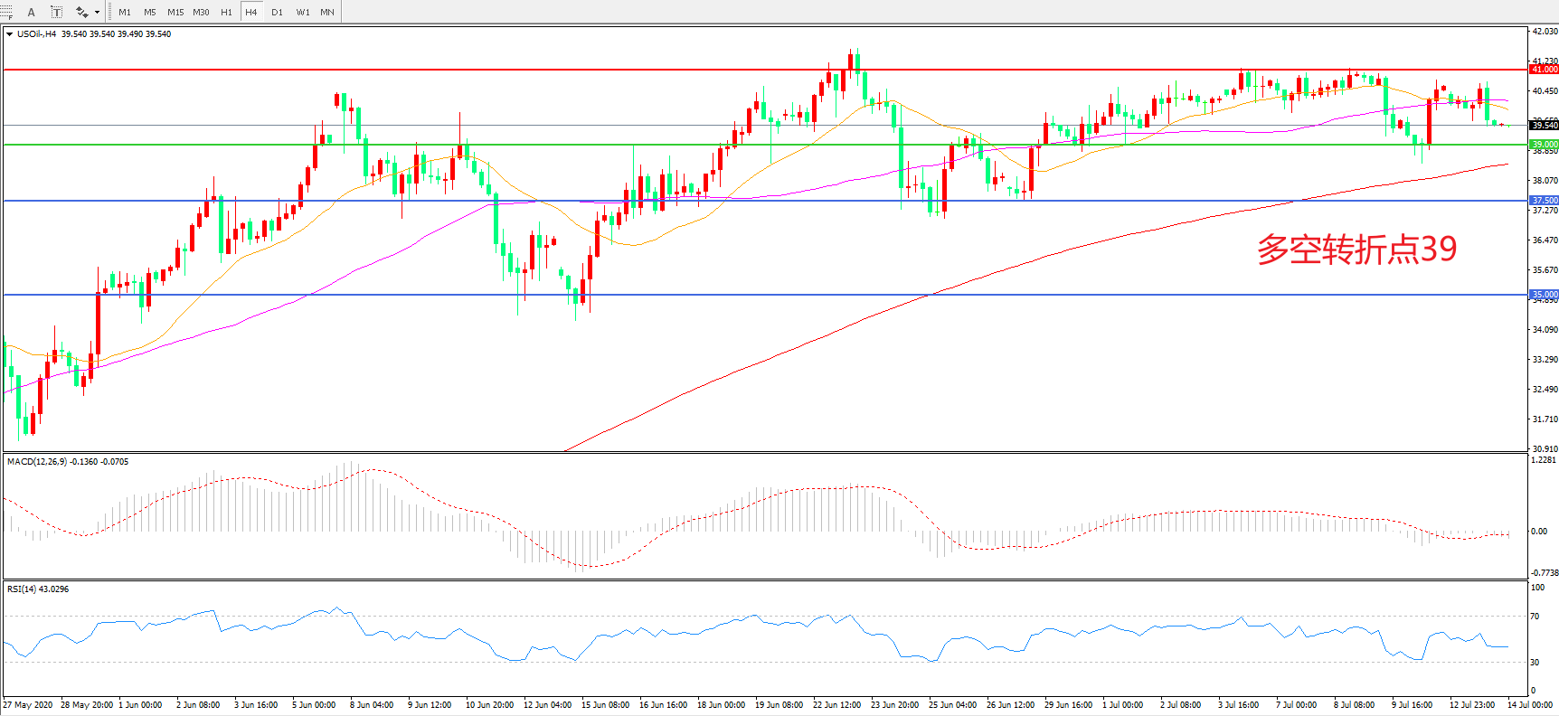 周一(7月13日),美国新冠确诊病例累计超过335万,疫情的蔓延引发对需求的担忧,美国WTI原油震荡下行,收报39.56美元/桶。疫情二次蔓延叠加经济复苏停滞,使得原油需求前景依旧不明朗,疲弱的动能增加了油价继续受阻于41美元下方盘整,并可能深度回调的风险。