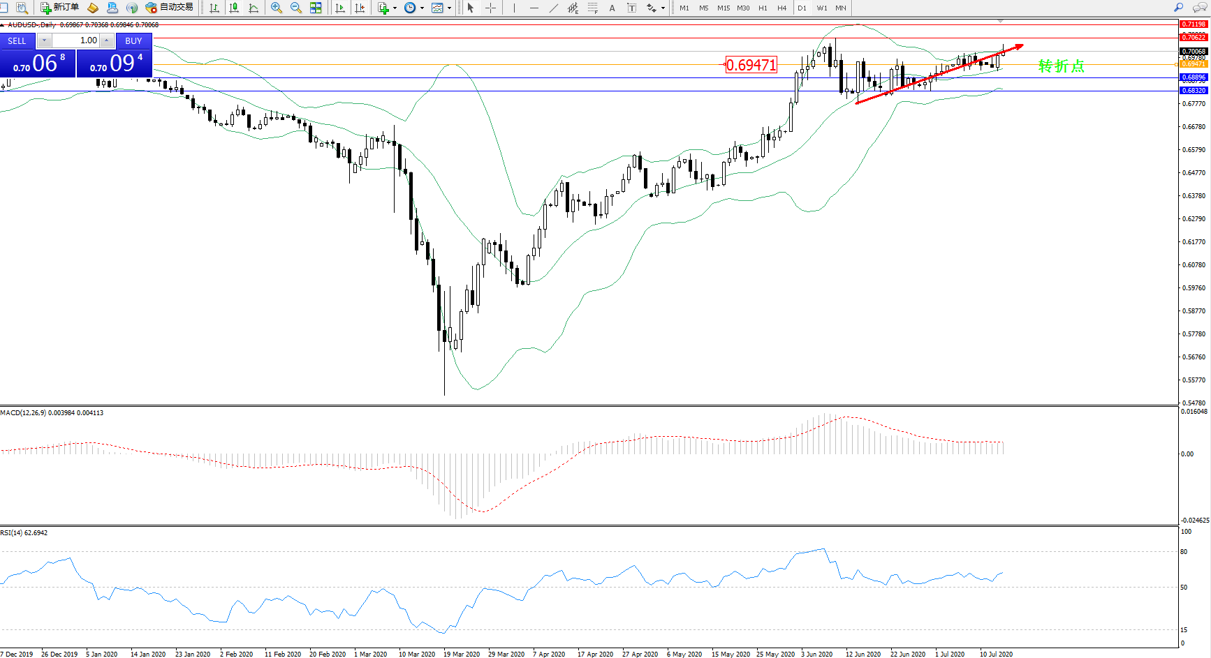 交易策略:0.69471上方看涨,目标0.70622、0.71198