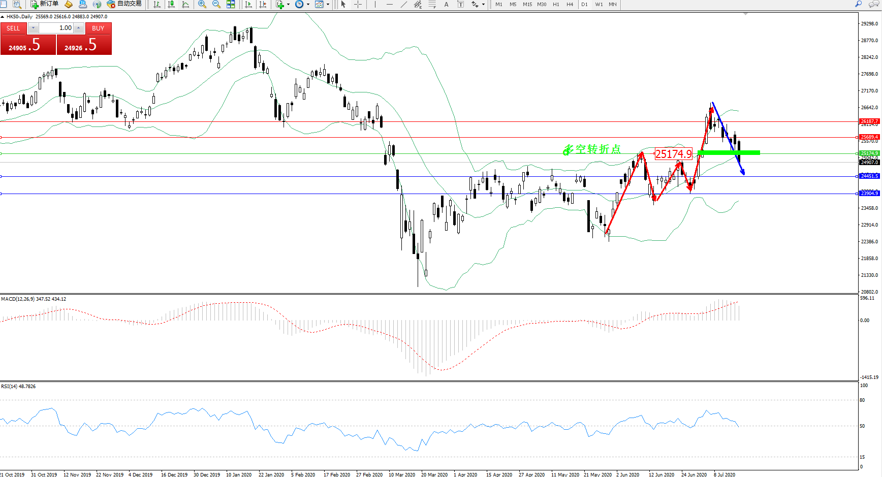 技术点评:多头动力呈阶梯式震荡上扬后,高位触及前期低位支撑转压制节点后开始震荡回撤下移,跌破布林带指标中轨进入中下轨区间震荡,布林带指标呈收口走势持续中,空头下行动力或将维持下行态势,且尚未有止步迹象,MACD指标处于0轴线上方多头区域高位弱势震荡回撤中,RSI指标高位空头动力处于多头区域持续震荡回撤至50均衡线附近徘徊中;
