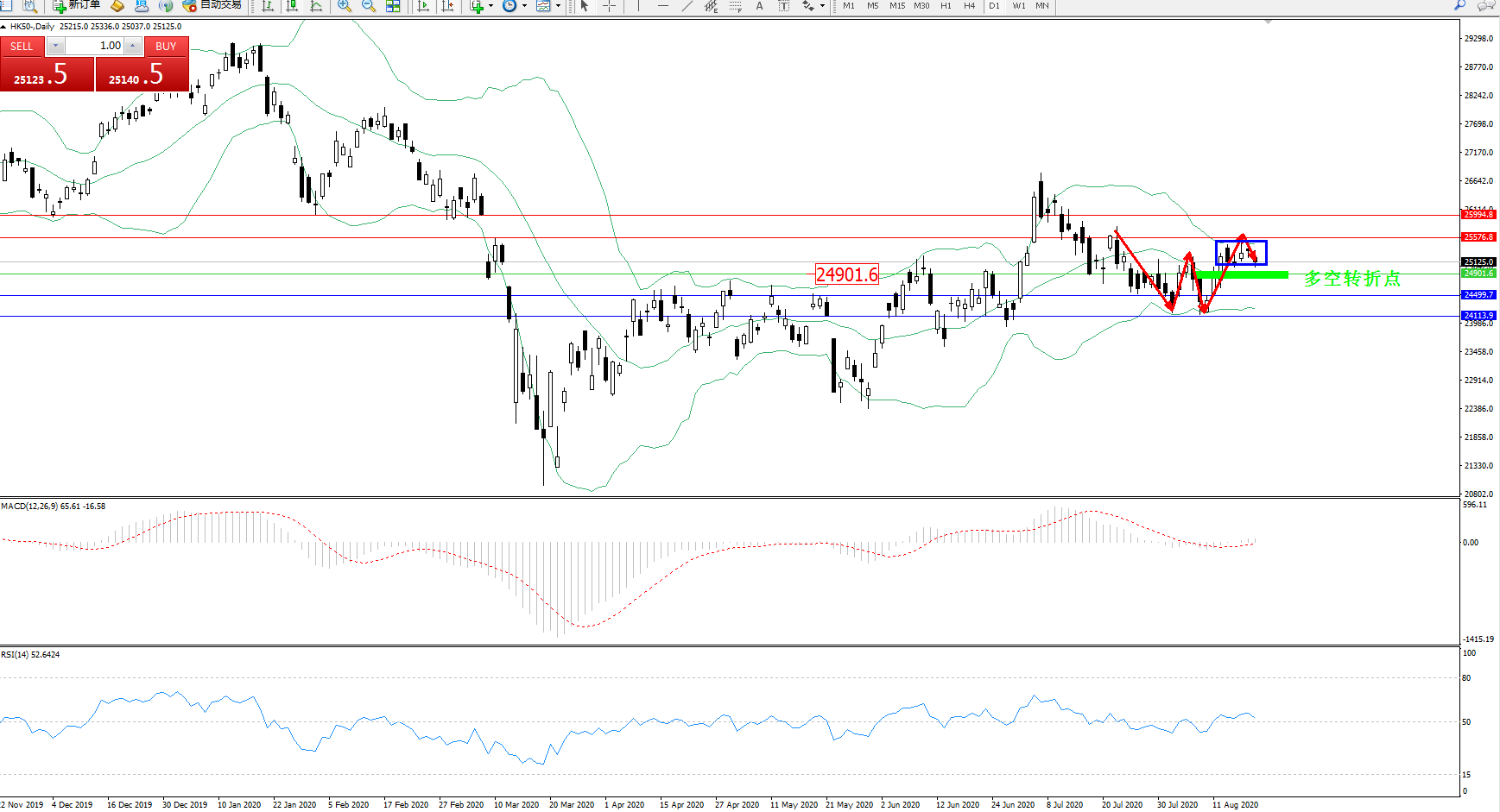 香港恒生指数8月19日(周三)收盘下跌188.47点,跌幅0.74%,报25178.91点;因8号东南烈风或暴风信号生效,港交所取消早市交易。证券市场及衍生产品市场于下午1时30分恢复交易,开盘后恒指急挫近300点,并维持横盘震荡至收盘。内险股全线下跌,中国人寿跌4.4%;恒生科技成份股中,京东涨近5%,小米升3.36%创2年新高,阿里巴巴涨1.35%。南下资金小幅净流入1.13亿港元,大市成交额为845亿港元。港股大市仍处于调整期,但预期下跌空间不多,恒指可在24000点之上站稳。在8月业绩公布峰期临近,建议提前部署中期业绩有惊喜的股份。