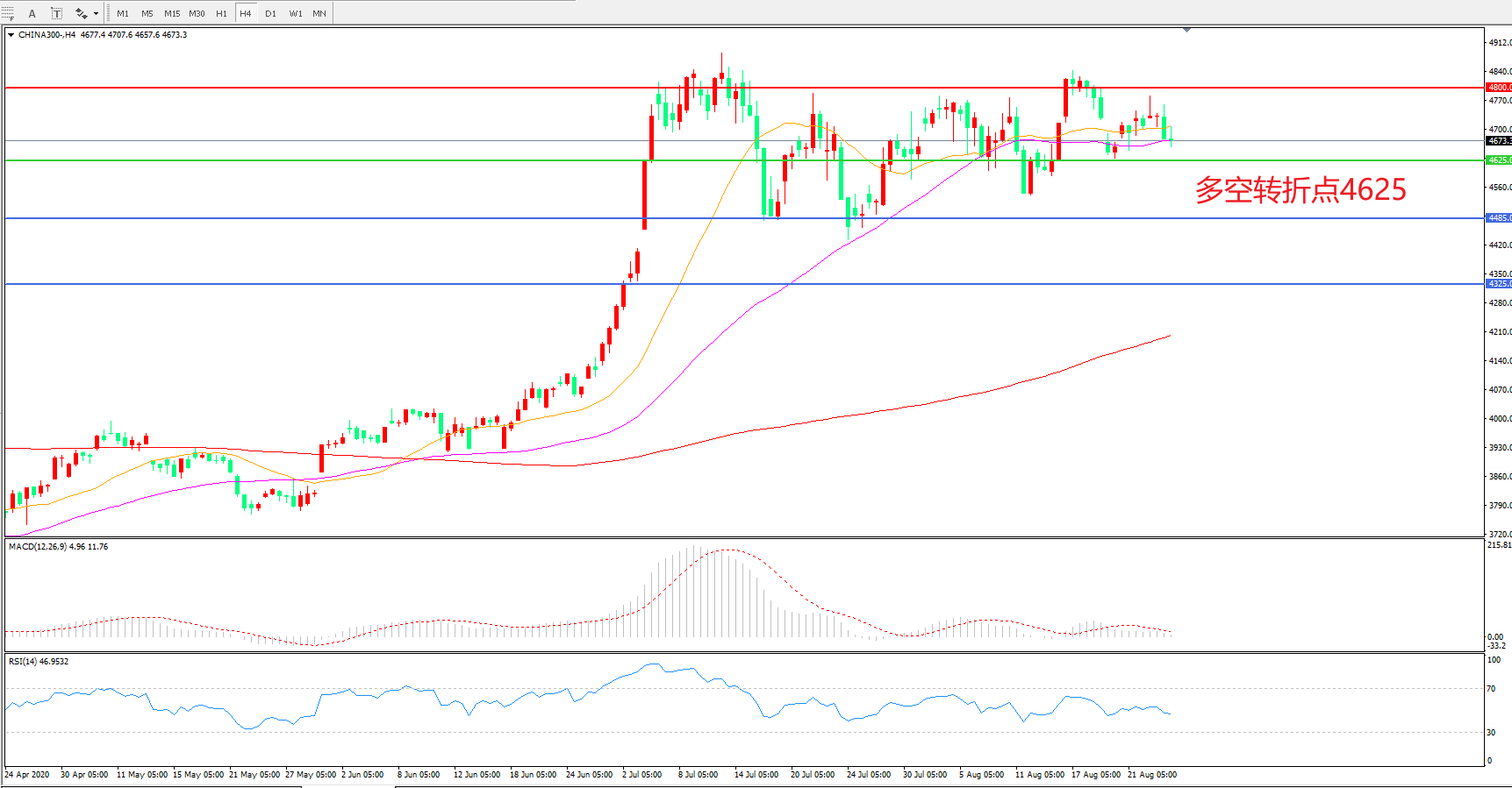4小时图看,沪深300延续宽幅震荡,整体表现相对低迷,4625成为短期支撑,4800成为上方阻力,均线系统走平, MACD红柱缩短,RSI指标向上,日内延续震荡概率较大。