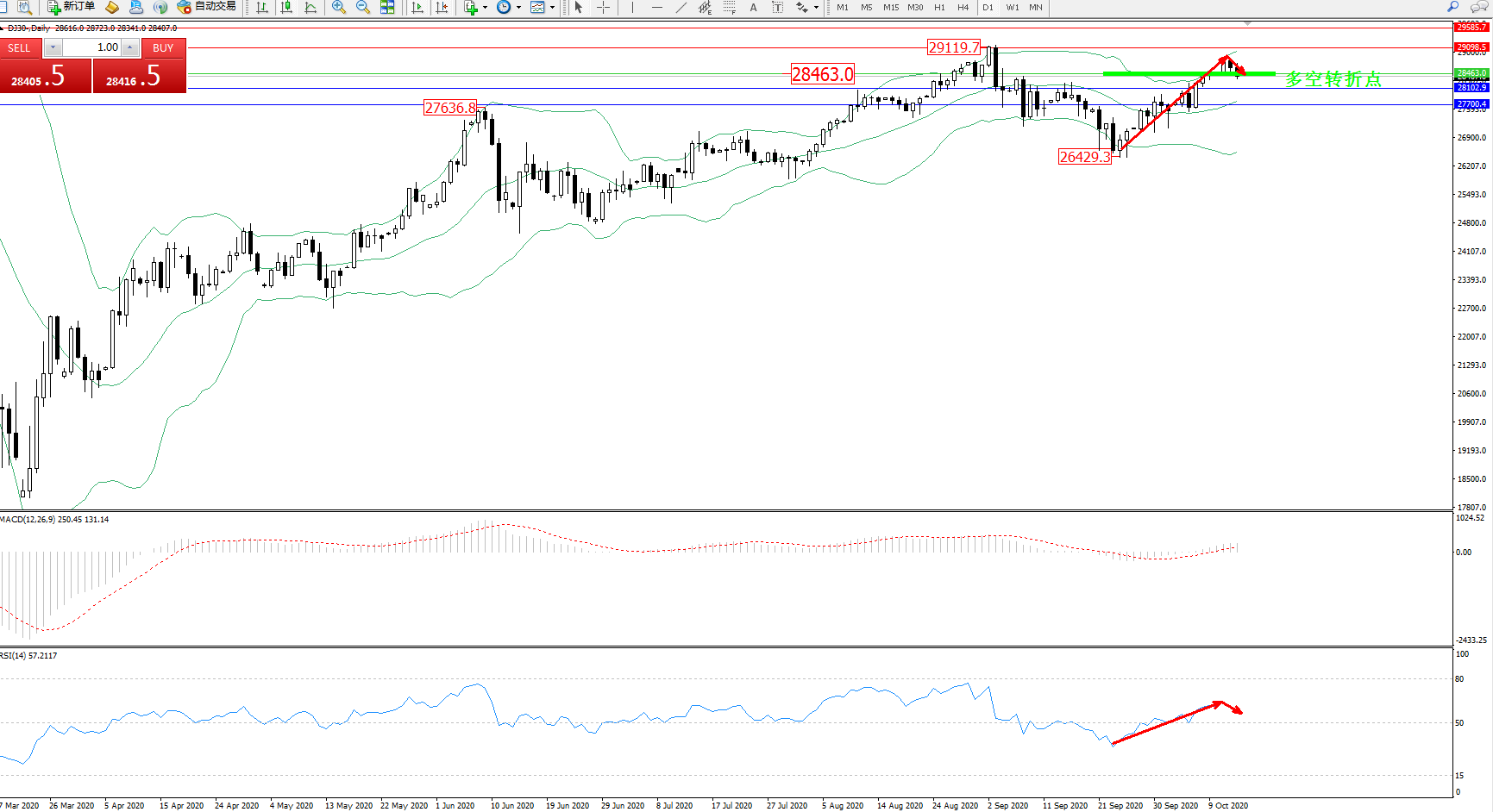 道琼斯指数10月14日(周三)收盘下跌165.80点,跌幅0.58%,报28514.00点。美股周三收跌,主要股指连续第二个交易日下滑。银行财报好坏参半。美国财政刺激谈判仍陷僵局、新冠疫苗试验连续受挫等消息令市场承压。美国财政部长努钦表示,他和众议院议长佩洛希在救助计划的某些细节上存在"很大分歧",在大选前很难达成协议。纽市早盘美元延续下跌势头,此前有数据显示,美国9月生产者物价涨幅高于预期,因酒店和汽车旅馆住宿成本飙升,导致自今年3月以来首次出现同比上涨。因担忧新冠疫苗上市时间,以及对美国在11月3日总统大选前就新的财政刺激方案达成一致的预期降温。目前美元只是在经济刺激消息的影响下上下起伏,波动幅度不会不大。