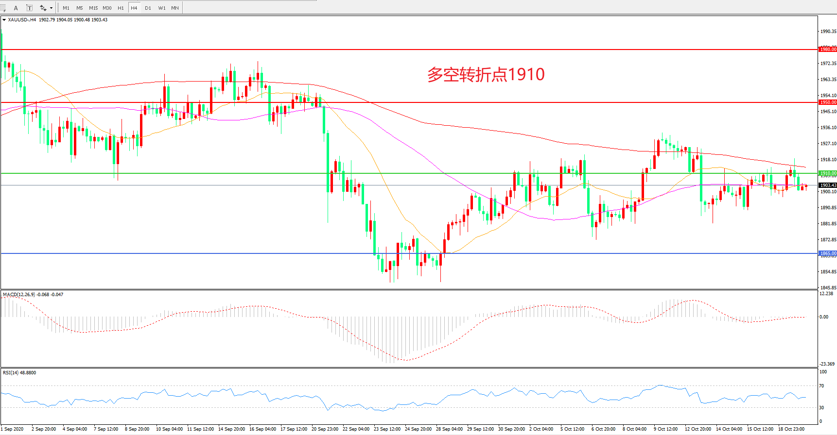 4小时图看,金价延续低位震荡,200均线成为明显阻力,1910成为短期多空分水岭,均线系统走平,MACD红柱增加,RSI指标走平,近期延续震荡概率较大。
