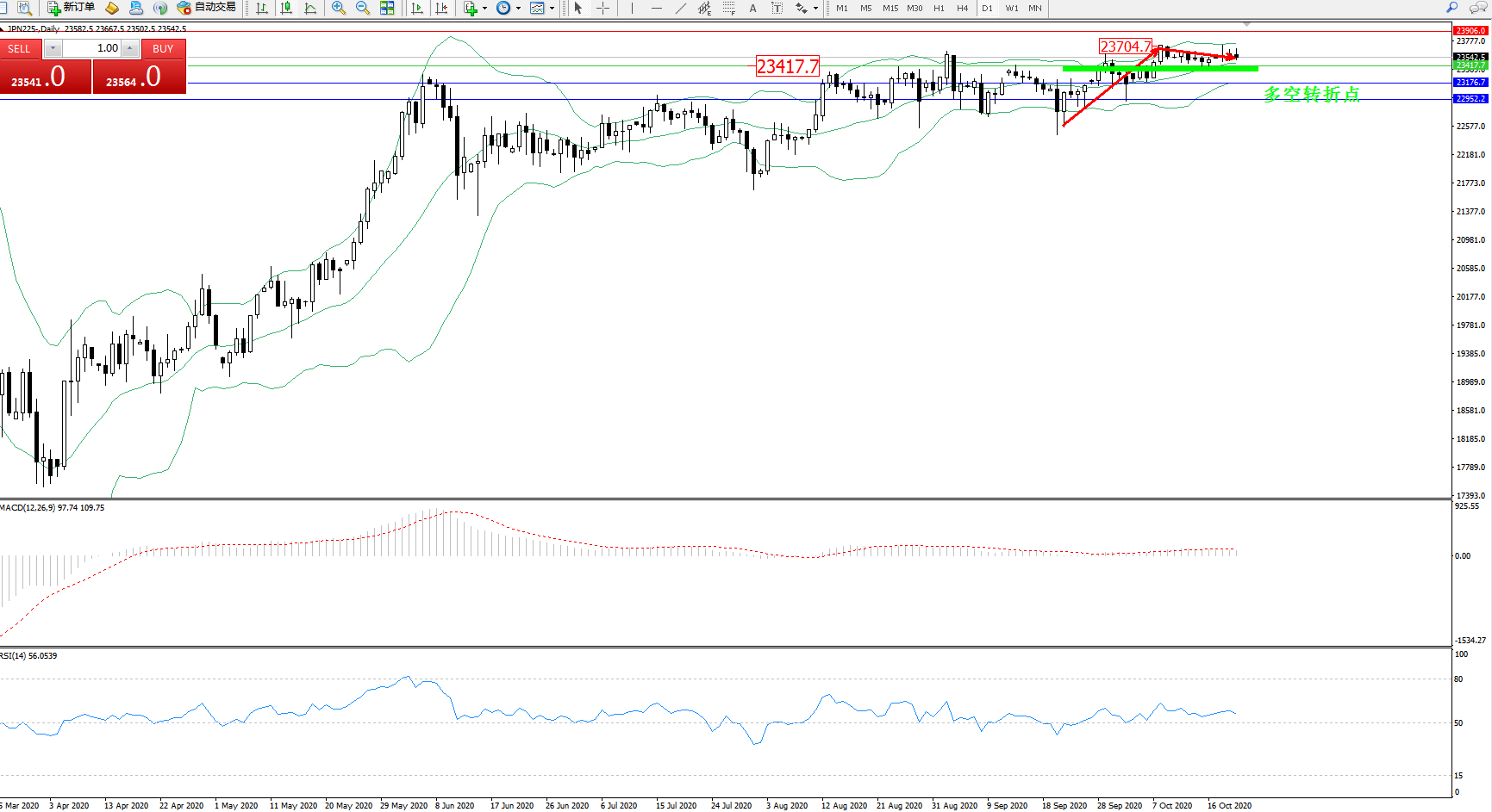日经225指数10月21日(周三)收盘上涨63.96点,涨幅0.27%,报23631.00点。美国大选投票日前资金选择离开美国暂避风头;美国大选选情胶着,计票可能出现延迟甚至僵局的顾虑,也让投资者在投票日来临前选择出脱美元计价资产,自然,疫情控制相对较好,经济率先进入复苏周期的亚太市场是资金的主要流向,这在日内稍早推动了亚系新兴市场国家货币汇率普涨之后,日本央行官员表示,日本央行承诺维持宽松的货币政策,增加货币基础,直到通货膨胀稳定达到其目标,在支持经济方面发挥关键作用,日本价格面临强大的下行压力,即使价格增长转为正数,通货膨胀也可能不会加速,为什么通货膨胀不再加速的问题需要重新真诚地研究。