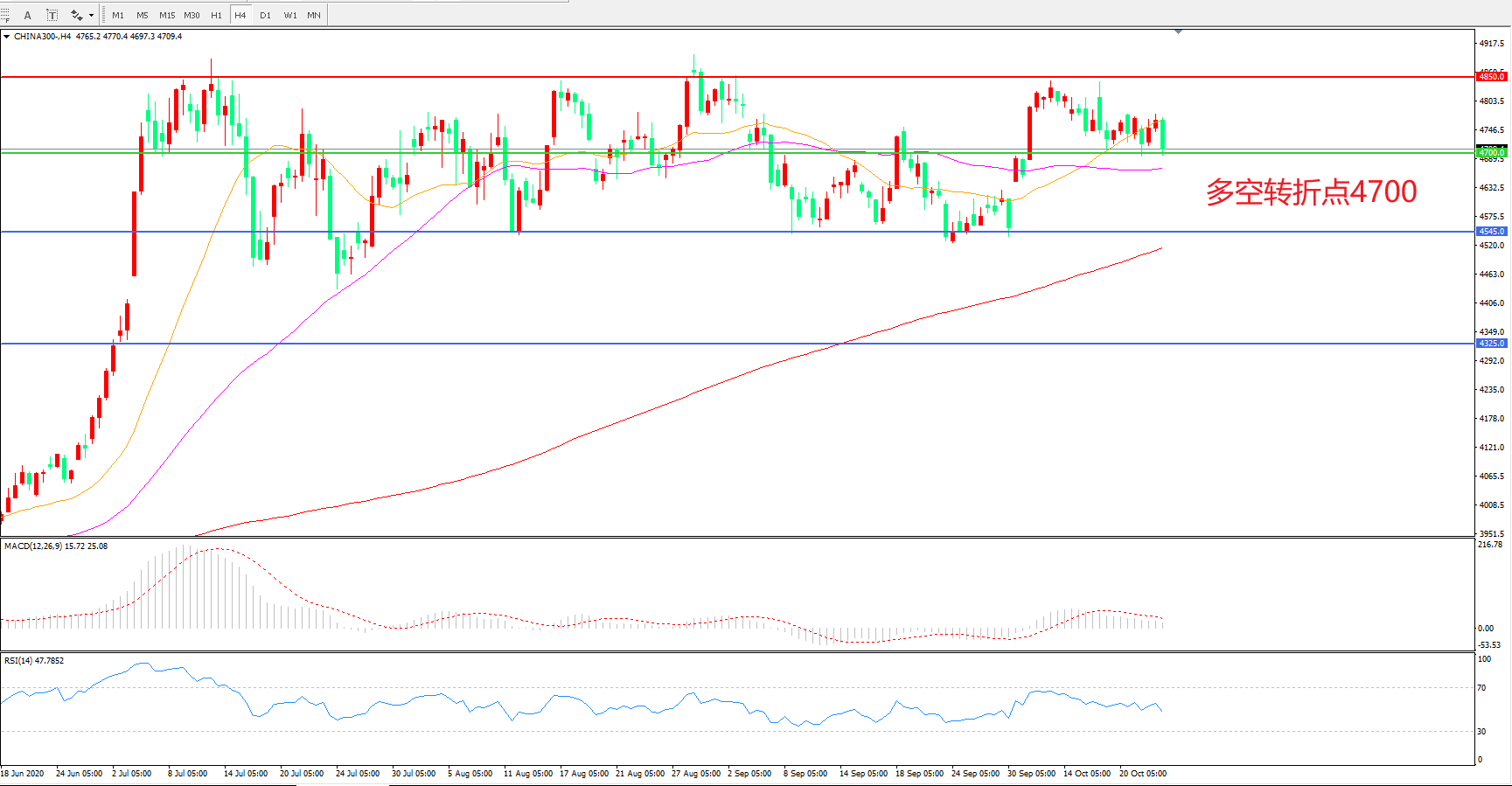4小时图看,沪深300延续高位震荡,整体表现疲软,反弹高点逐渐减低,4700成为短期支撑,均线系统走平, MACD红柱缩短,RSI指标向下,日内延续震荡概率较大。