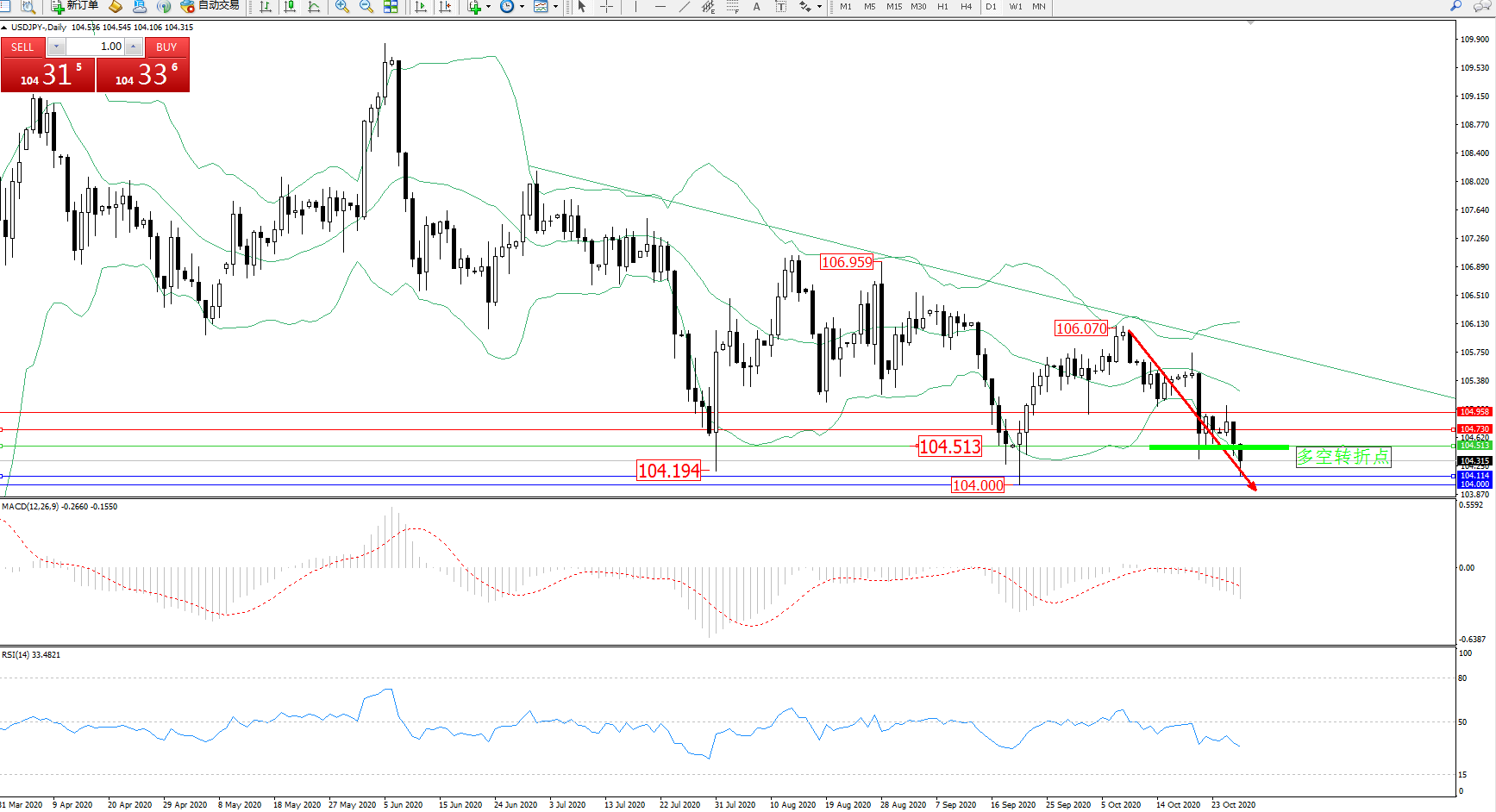 技术点评:空头动力延续布林带指标下轨附近持续震荡下行态势良好,跌势未有止步迹象,布林带指标呈张口走势持续中,前期低位104附近近在咫尺破位在即,MACD指标处于空头区域弱势震荡持续向下移动走势中,RSI指标处于空头区域持续震荡平移后有继续下行态势;