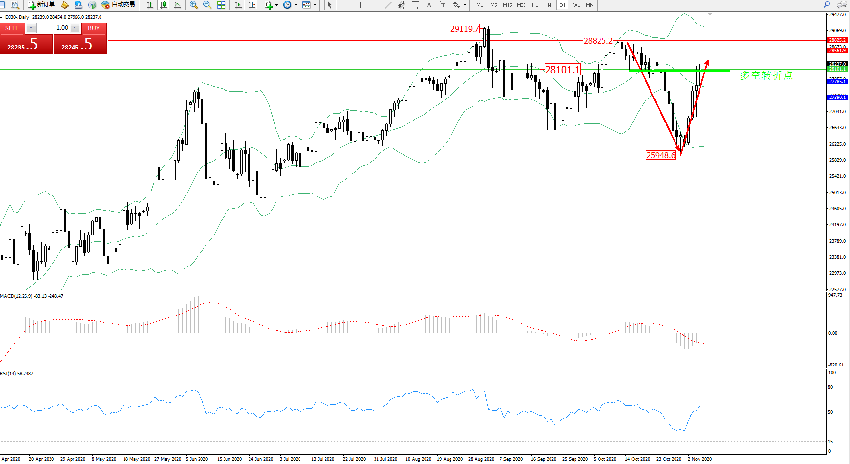 技术点评:空头动力延续布林带指标下轨持续下行后,低位触及25948附近得到支撑强势反转呈V型态势拉升上扬,突破布林带指标中轨附近节点进入中上轨区间震荡,有进一步上扬态势,布林带指标呈收口走势持续中,关注中上轨区间转折点,MACD指标处于空头区域低位弱势整理上移中,即将触及0轴线附近节点,RSI指标处于空头区域震荡后强势拉升上扬,突破50均衡线后有继续上行态势;