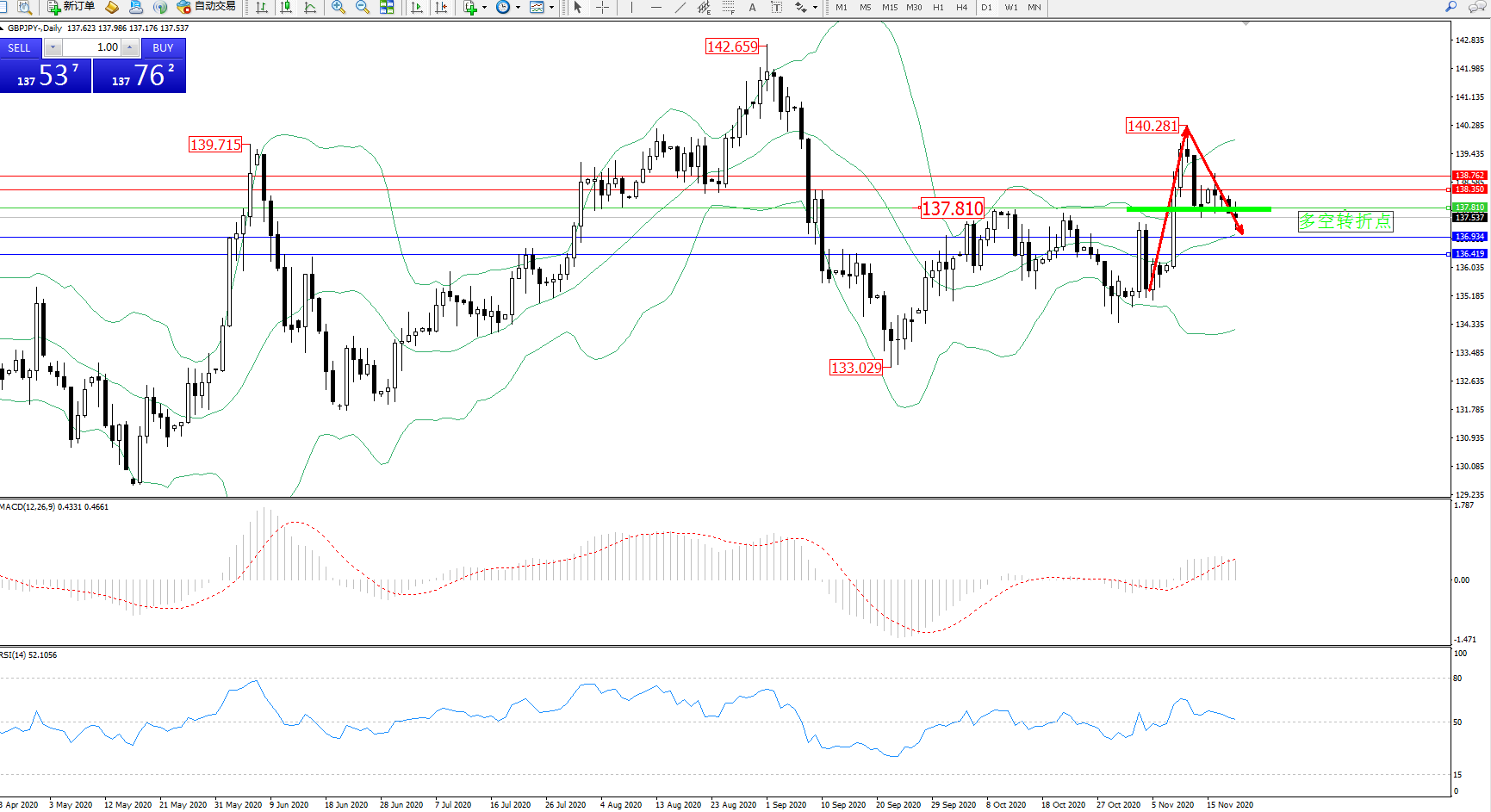 技术点评:多头动力延续布林带指标上轨附近强势拉升上扬后出现反转下移,高位抵达140.281附近后遇阻开始快速回撤,多头拉升动力结束,空头下行动力入场,即将触及布林带指标中轨附近节点,布林带指标呈张口走势后有收口迹象,MACD指标低位多头多空持续震荡上扬至0轴线上方多头区域维持震荡,RSI指标处于50均衡线上方多头区域震荡后开始缓慢下行中;